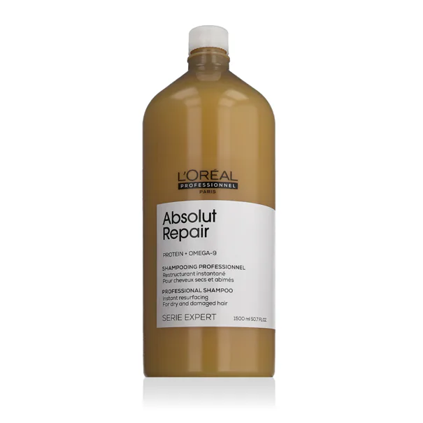 L'Oréal Professionnel Serie Expert Absolut Repair Protein + Omega 9 Shampoo 1500 ml je obnovující šampon pro velmi poškozené vlasy, který jemně čistí a zároveň poskytuje hloubkovou výživu a posílení vlasového vlákna. Díky obsahu proteinů a omega-9 mastných kyselin navrací vlasům pružnost, lesk a odolnost bez zatížení.