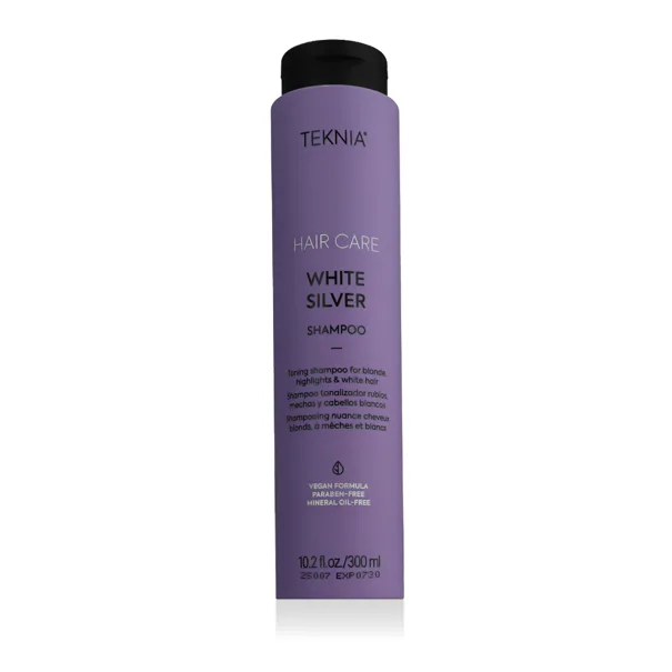 Lakme Teknia White Silver Shampoo je tónující šampon pro blond, šedé a odbarvené vlasy, navržený k neutralizaci nežádoucích žlutých a teplých tónů. Díky obsahu fialových pigmentů a organického oleje z acai jemně čistí vlasy, obnovuje jejich chladný odstín a současně je hydratuje a chrání před vysoušením.